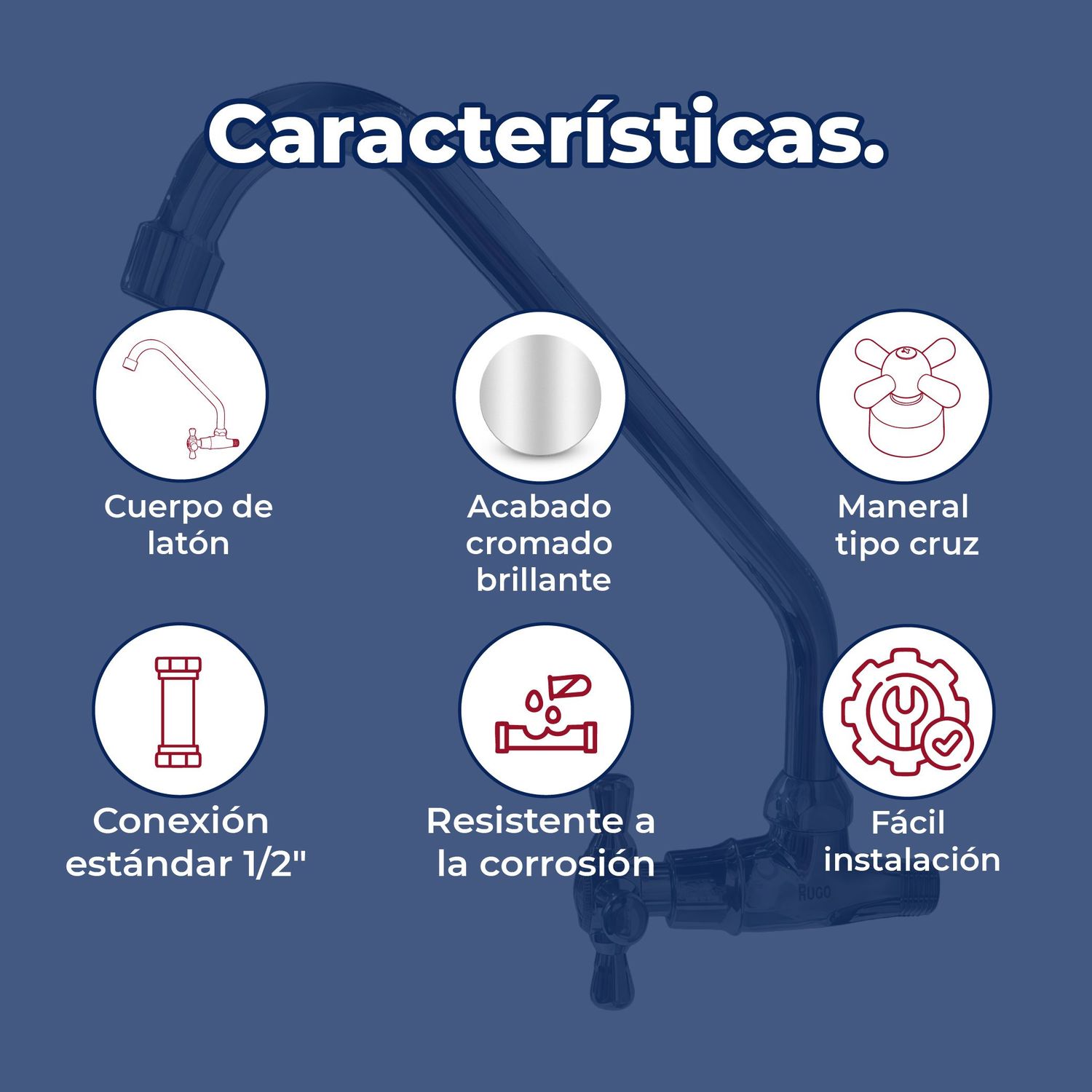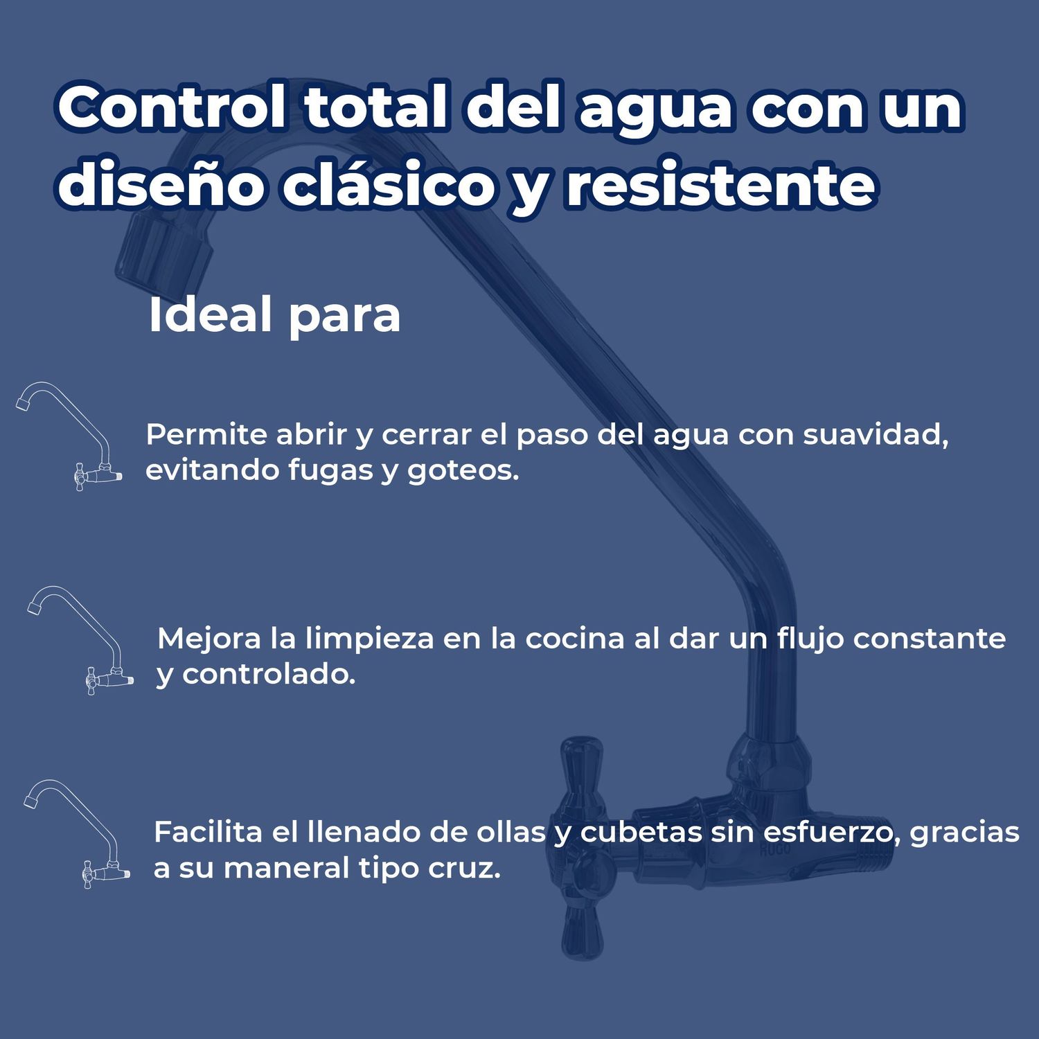Equipada con cartucho cerámico y cierre a 90° que proporciona un control preciso y duradero del flujo de agua. El maneral cruceta metálico ofrece un agarre tradicional y seguro, ideal para uso diario. El dispositivo de salida con aireador optimiza el flujo de agua reduciendo las salpicaduras y mejorando la eficiencia. Con alimentación de 1/2" NPT, es compatible con instalaciones estándar de pared, siendo ideal para proyectos de remodelación o construcción nueva.