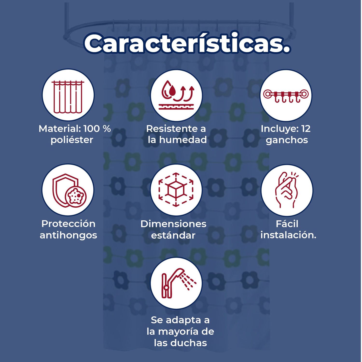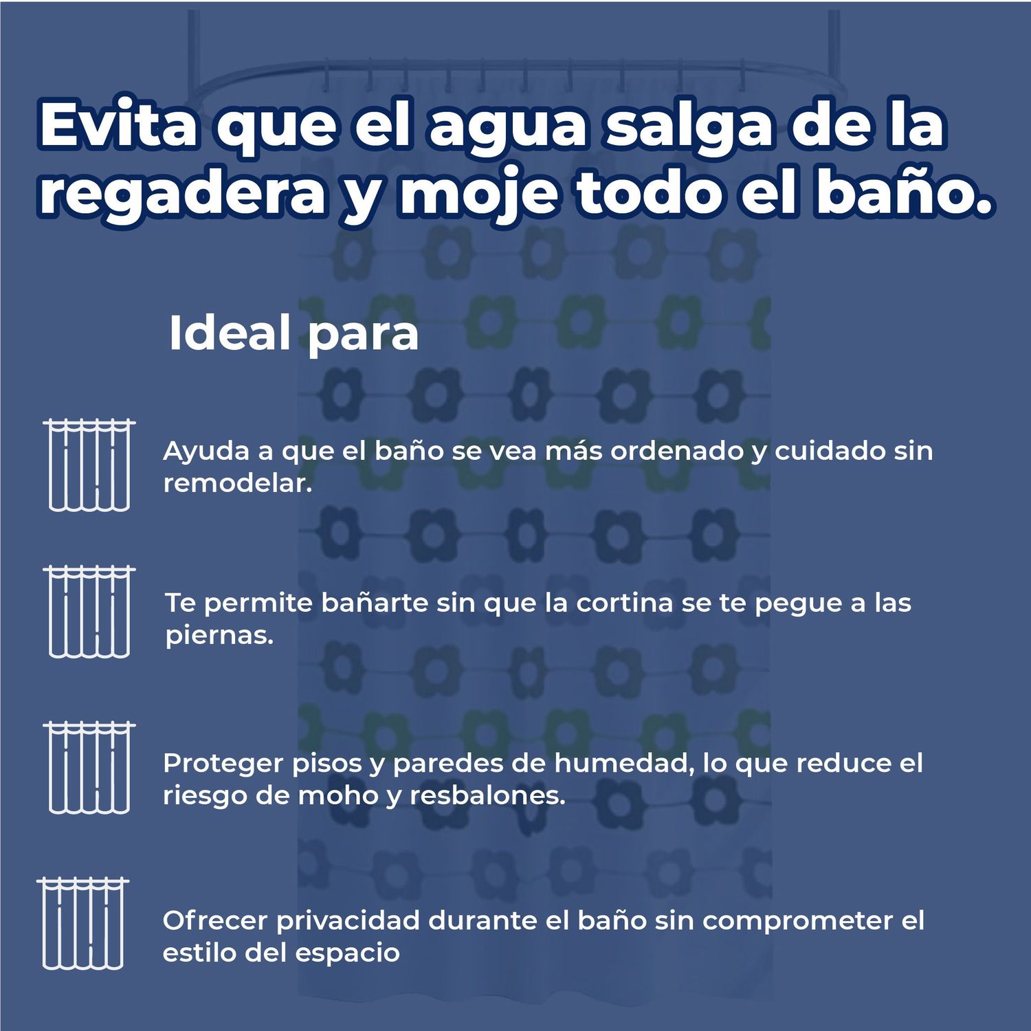 Su principal beneficio es la alta durabilidad y resistencia a la humedad que ofrece su tejido de poliéster de 180x180 cm, el cual evita la formación de moho y asegura un secado rápido, manteniendo el baño higiénico y estético por más tiempo. Gracias a su diseño Flover Line, esta cortina de Euro Showers no solo cumple una función práctica al impedir las salpicaduras de agua, sino que también aporta un toque decorativo moderno y elegante que se adapta a cualquier estilo de cuarto de baño, siendo además muy fácil de lavar y mantener.