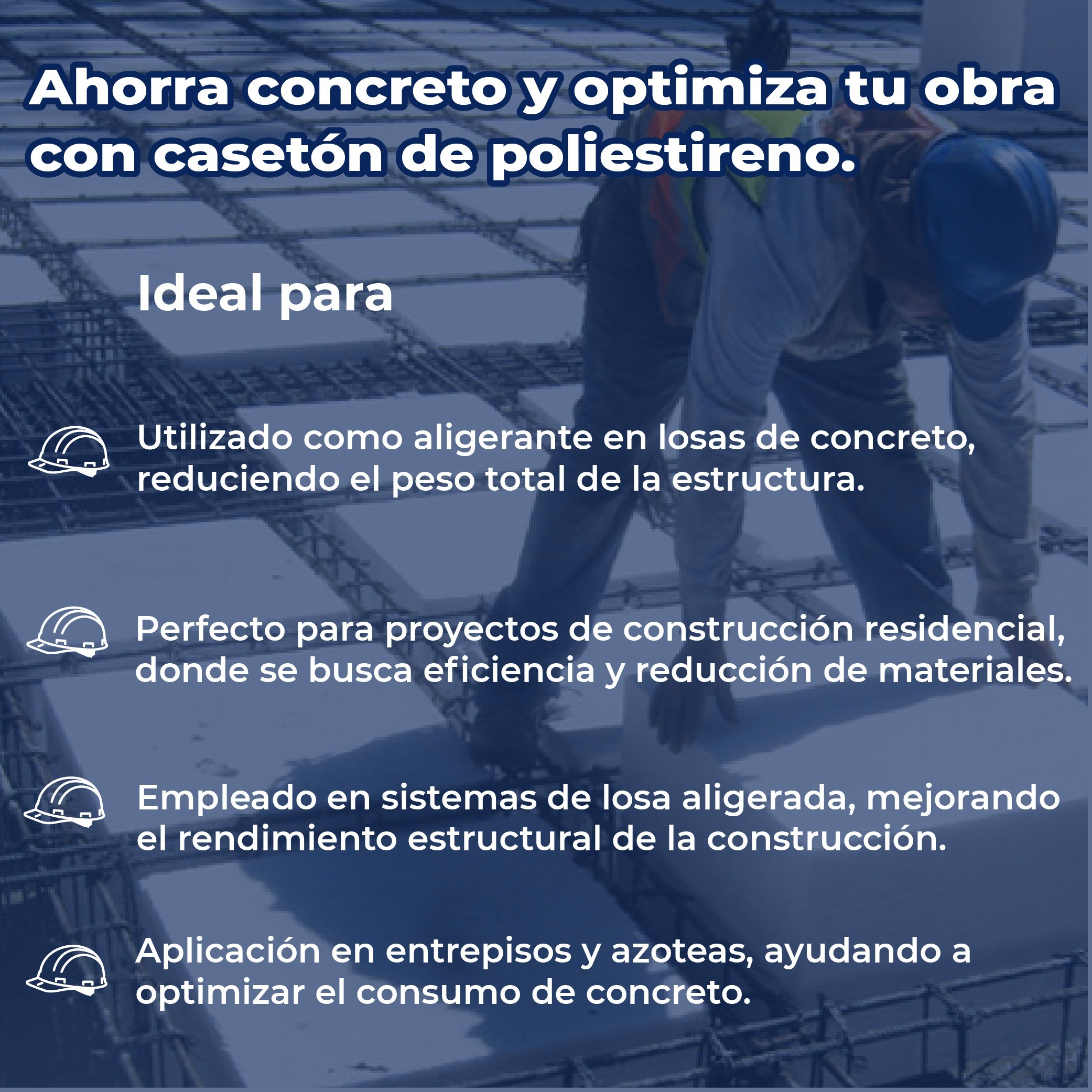 El casetón poliestireno es un bloque expandido de 40 x 40 x 10 cm. es perfecto para el diseño de losas ligeras y resistentes. Con su aislamiento térmico integrado, este casetón te permitirá ahorrar en materiales como el concreto y el acero de refuerzo. Aprovecha ahora los beneficios de este producto y construye con calidad y eficiencia. se usa para el aligeramiento de losas de claros grandes, aislamiento de techos, juntas de colindancia, relleno y nivelación de losas, desplazamiento de concreto y rellenos de cimentación.