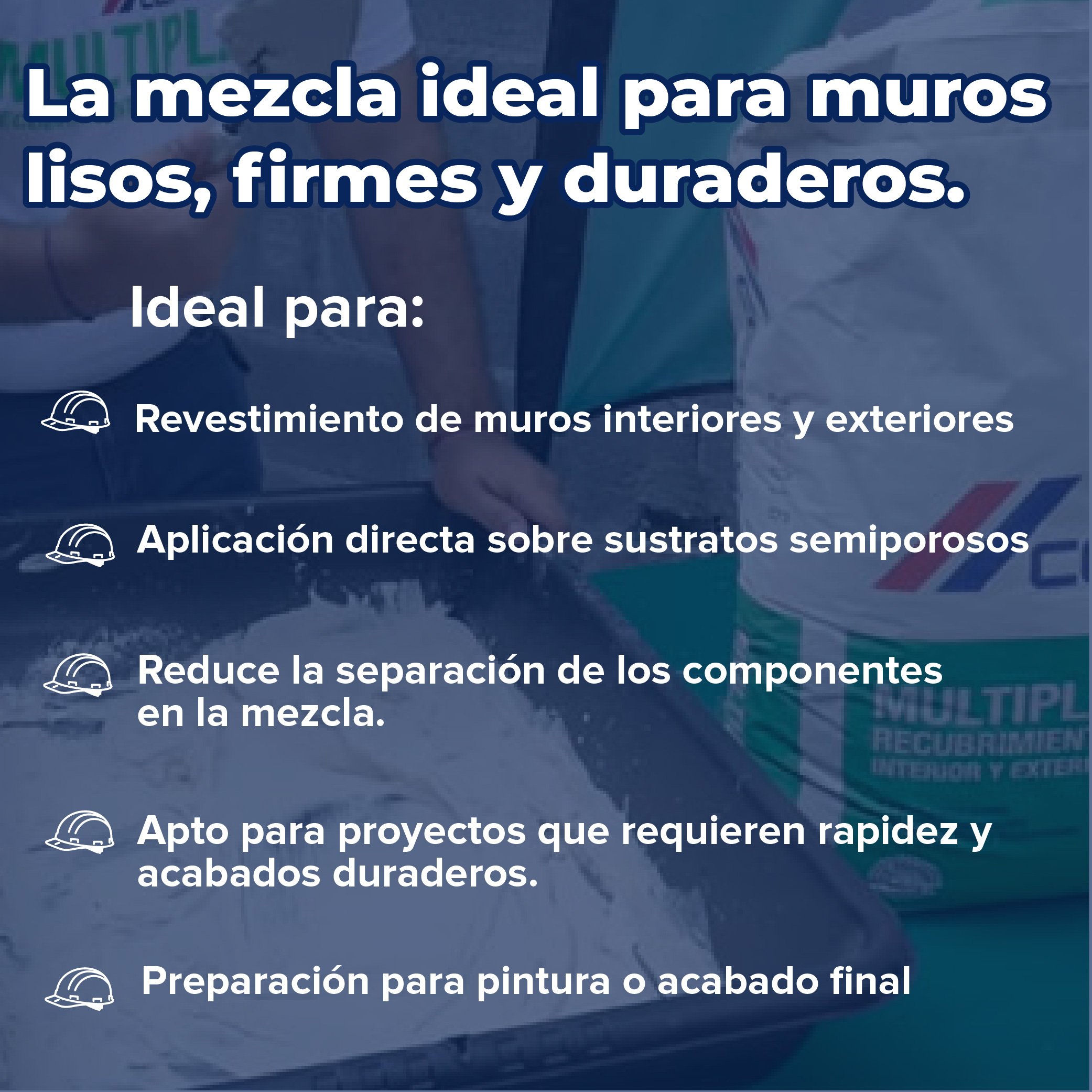 Cemex Multiplast es un producto a base de cemento blanco, agregados seleccionados y aditivos especiales que al mezclarse con agua, se convierte en una pasta de fácil colocación tanto para recubrimientos interiores como exteriores, logrando una amplia variedad de acabados duraderos.