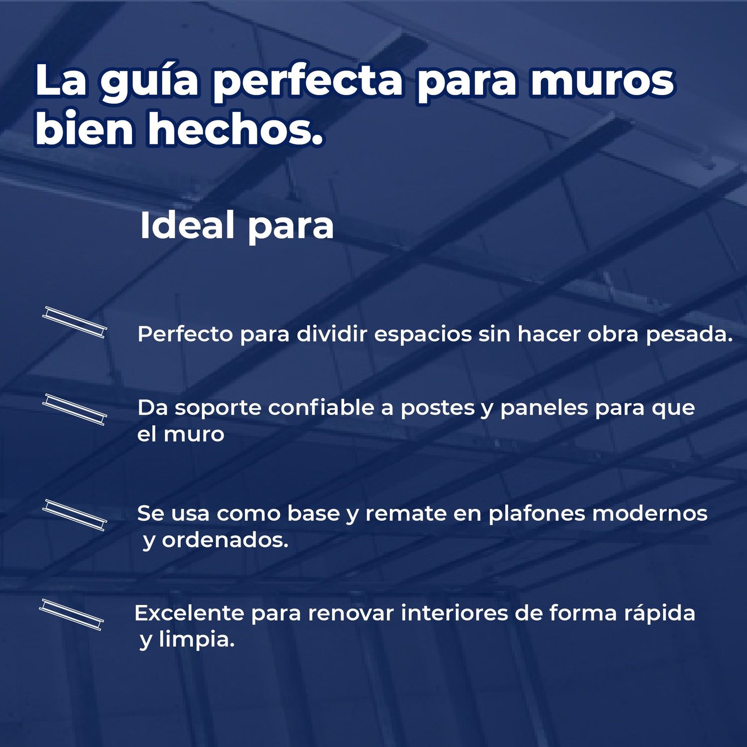 Su principal beneficio radica en su capacidad estructural, ya que funciona como el riel base (superior e inferior) para fijar los postes metálicos, creando bastidores firmes para muros divisorios, pecheras y cajillos. Al estar fabricado con acero galvanizado, ofrece una excepcional protección anticorrosiva contra la humedad y el óxido, asegurando una larga vida útil tanto en interiores como en exteriores.