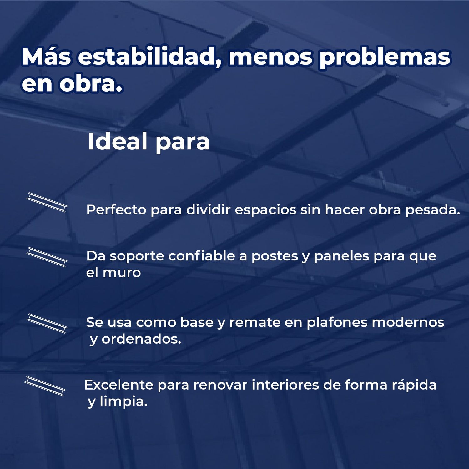 Su principal beneficio radica en su capacidad estructural, ya que funciona como el riel base (superior e inferior) para fijar los postes metálicos, creando bastidores firmes para muros divisorios, pecheras y cajillos. Al estar fabricado con acero galvanizado, ofrece una excepcional protección anticorrosiva contra la humedad y el óxido, asegurando una larga vida útil tanto en interiores como en exteriores.