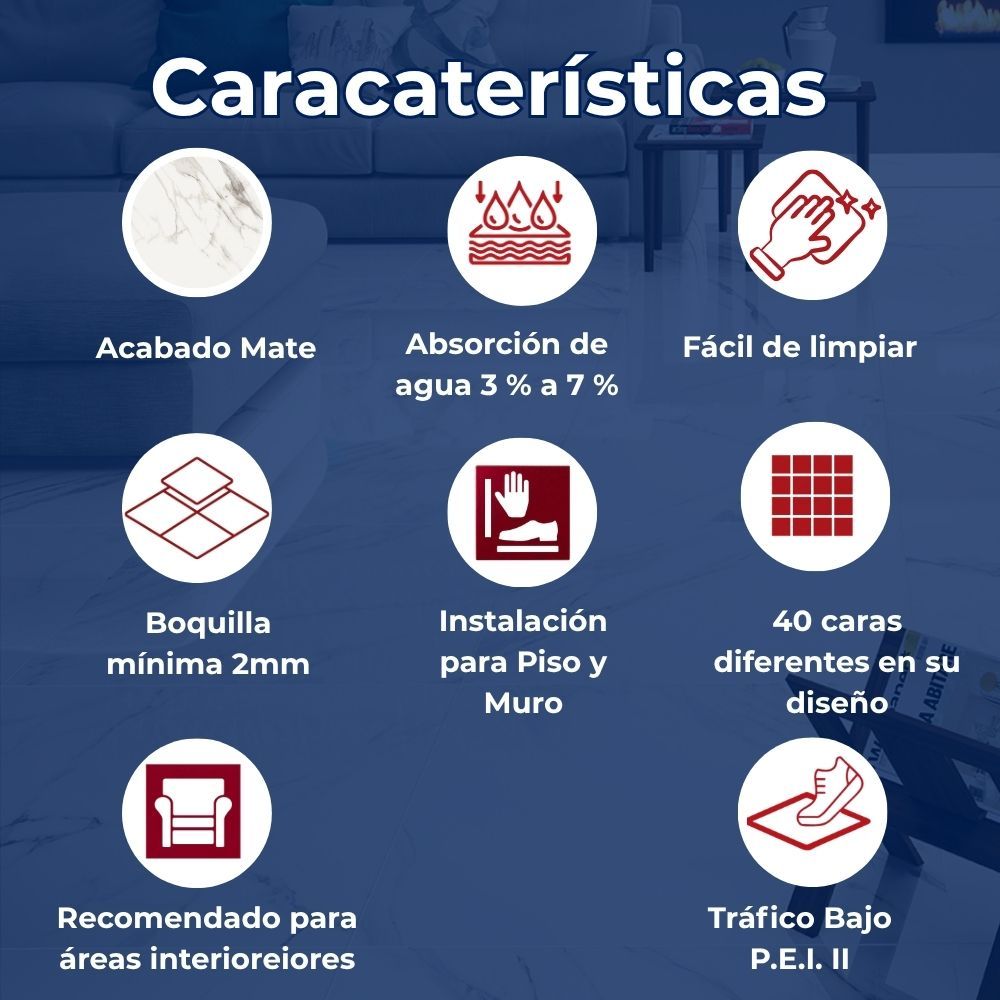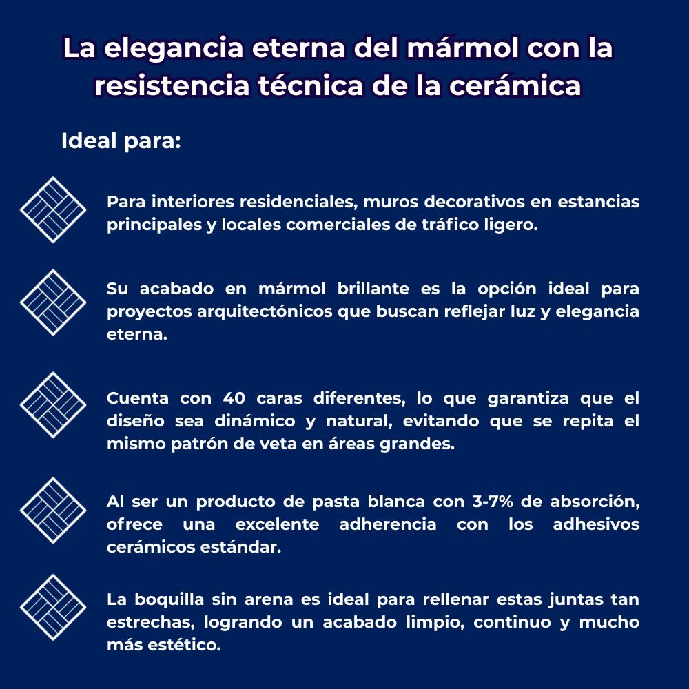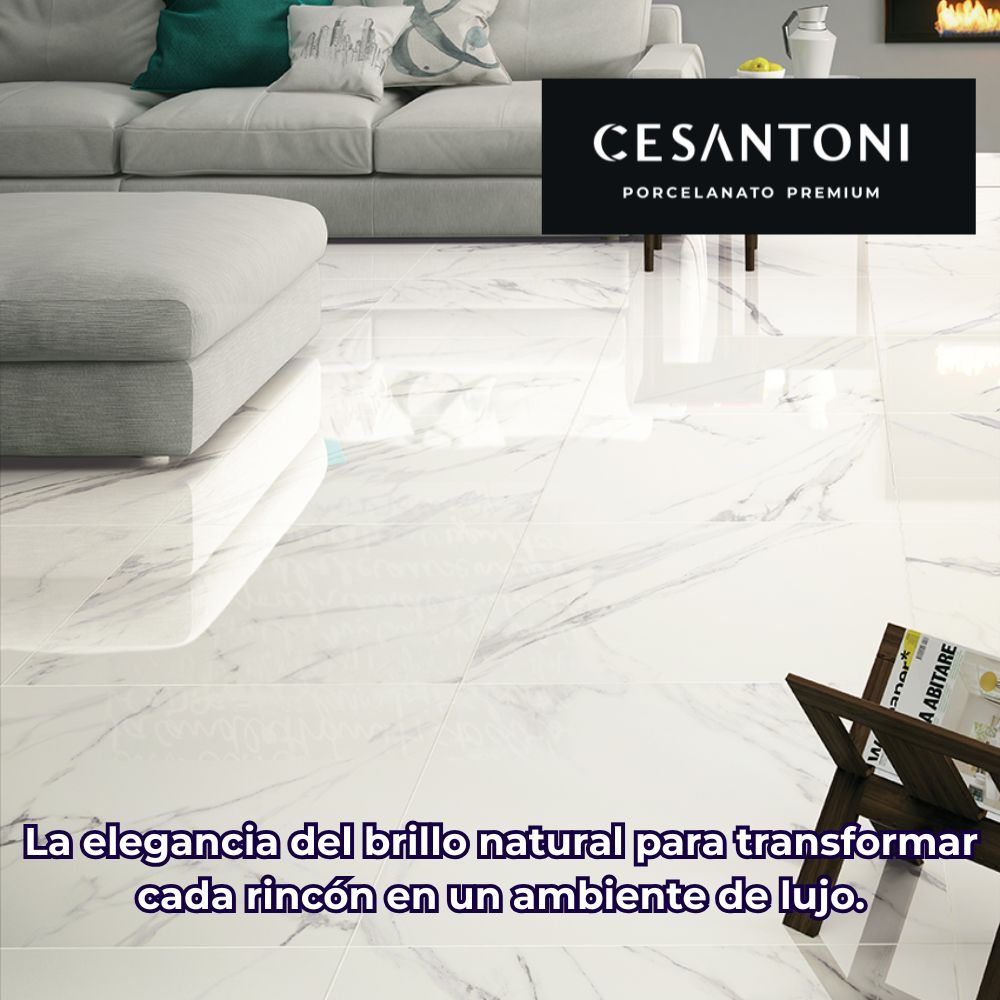 Su acabado rectificado, el cual permite una instalación con juntas mínimas de apenas 2 mm, creando superficies visualmente continuas y más higiénicas. Este recubrimiento de Cesantoni destaca por su diseño tipo mármol con alta variación de caras, lo que aporta un realismo excepcional y elegancia a espacios interiores residenciales como salas y baños.