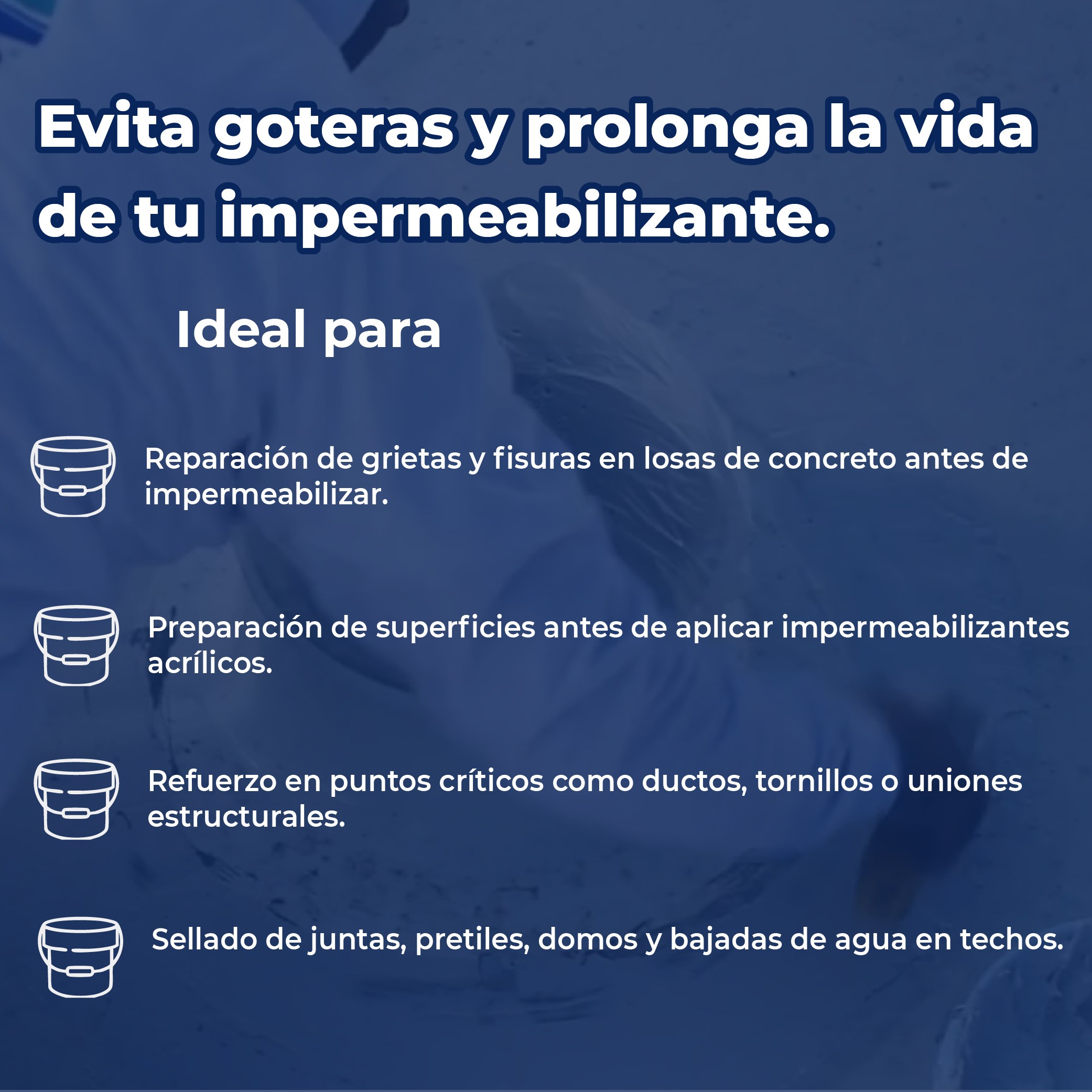 R= Sirve para sellar grietas, fisuras y filtraciones en techos, losas y superficies antes de aplicar impermeabilizante.