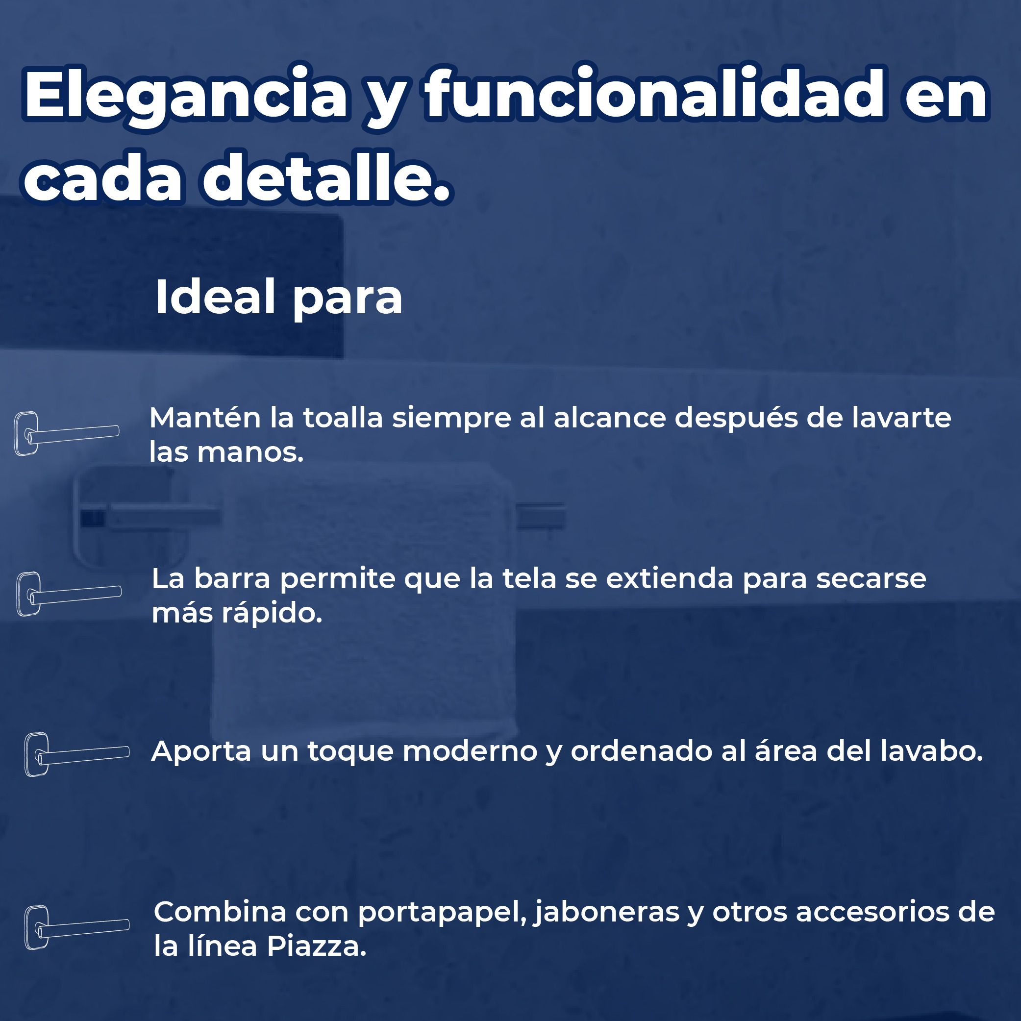 • Funcionalidad Práctica: Mantén tus toallas ordenadas y secas, mejorando la higiene y el orden de tu baño.