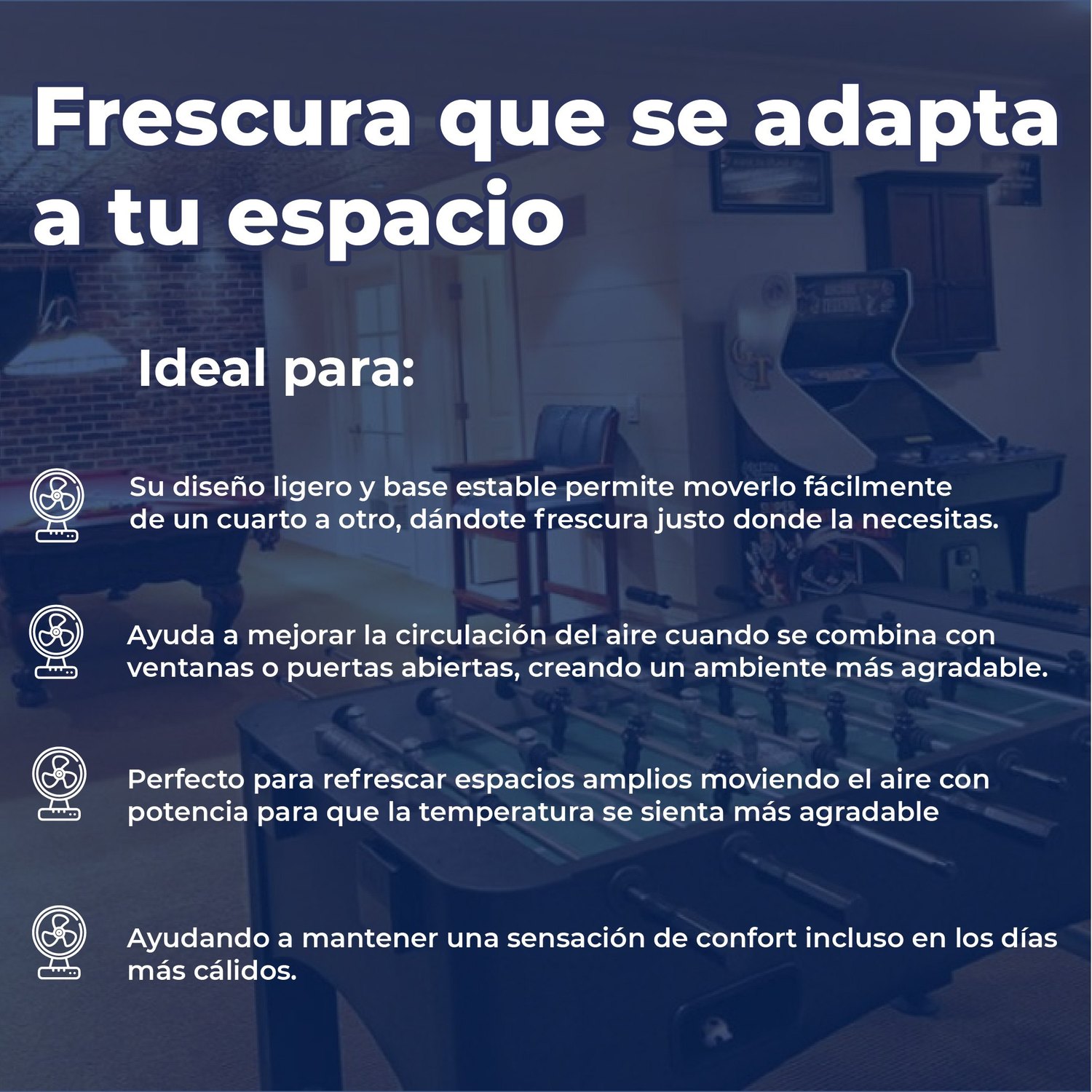 Su principal beneficio es la versatilidad de su diseño 2 en 1, el cual permite adaptar cada unidad como ventilador de pedestal o de piso según las necesidades de cada habitación, ofreciendo una solución de enfriamiento económica y eficiente para el hogar.